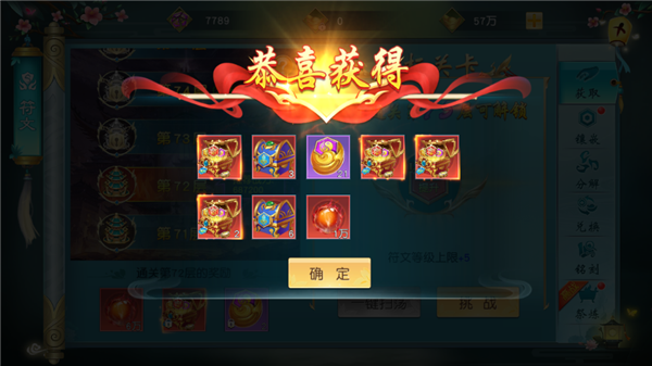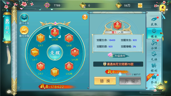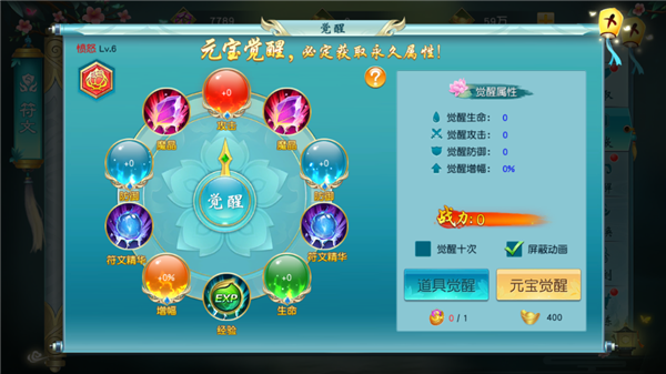 符文除了自身带有的基础属性外,还可以通过【觉醒】系统使用符文觉醒石或元宝来获得觉醒属性和其他道具,包括角色经验、符文精华、生命、攻击、防御、增幅等!使用元宝觉醒时,必定获得增加生命、攻击、防御、增幅四个加成属性之一,通关符文塔层数越高,觉醒的上限越高!