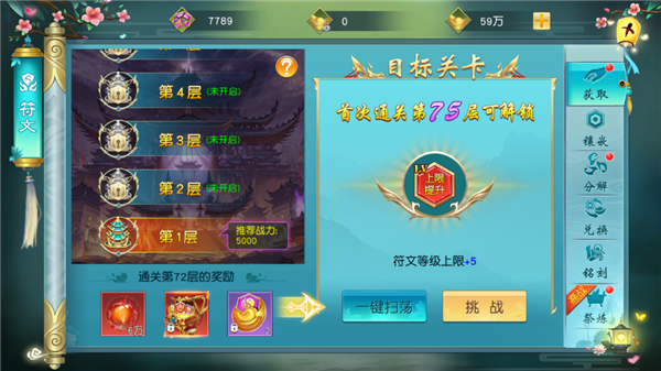 “符文塔”是获取符文的一个免费途径。符文塔共300层,通关符文塔可以获得大量符文和符文材料。每一关有1分钟的通关限制时间,挑战成功则可以获得通关奖励。每天重置符文塔的层数,可以通过一键扫荡至已通关的层数,获得大量扫荡奖励。