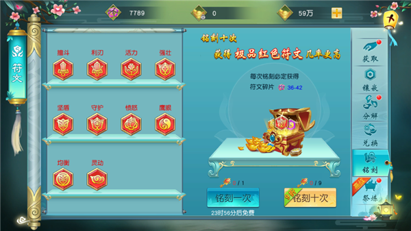 除了“符文塔”,符文还可以通过“铭刻”和“兑换”系统来快速获得。“符文铭刻”即符文抽奖,每次铭刻需要消耗铭刻钥匙,如果钥匙不足则可以花费88元宝来代替钥匙进行抽奖。“铭刻十次”获得极品红色符文的机率更高哦,建议有足够元宝的仙友使用该方式来抽取符文,性价比更高!