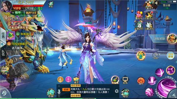 游戏主界面为常规的分布,左上方是人物头像、战力、VIP等级等基本信息,左边是【任务栏】。主界面下方居中是聊天框,角色技能分布在右下方,方便双手操作。整体布局相对合理,整体美观简洁!
