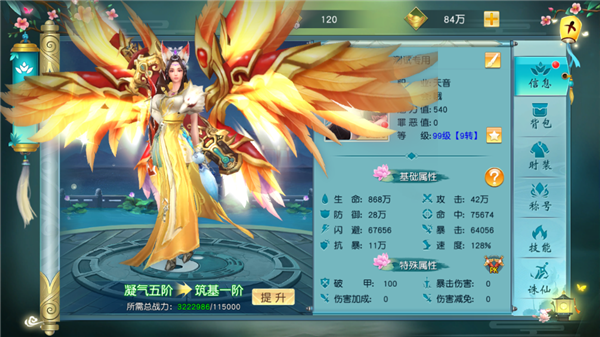 打开人物头像打开基本属性页面,首先来到角色基本信息属性界面。在这里可以直观看到当前人物的基本信息如角色名、等级、各属性值、战力、形象!