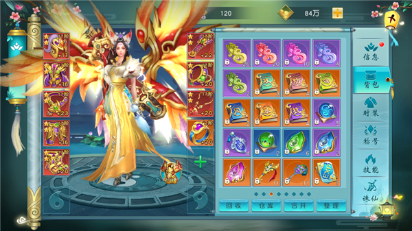 在游戏内打怪获得的道具全部会进入到背包里,在背包页面可以对多余的装备、宠物进行回收处理。当背包道具太多太杂时可以点击【整理】!同时背包系统左边是当前角色穿戴的装备展示,一目了然!