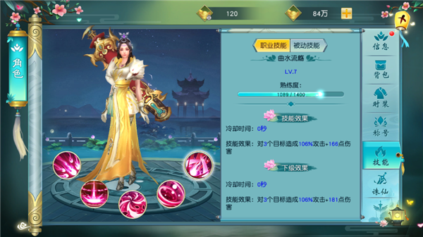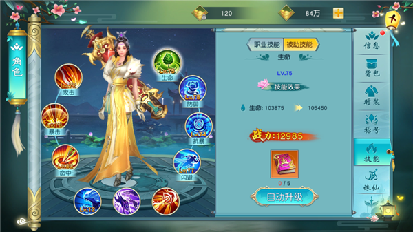 每个职业都有不同的技能,总共5个主动技能,9个被动技能!主动技能通过日常打怪累计熟练度升级,被动技能消耗技能书可以提升等级,获得更高的伤害!