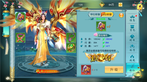 穿戴诛仙装备可提升人物属性。每个诛仙装备部位达到一定等级段后可激活该部位极品属性获得大量战力。诛仙装备可在合服活动的boss中掉落。