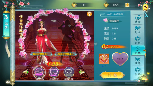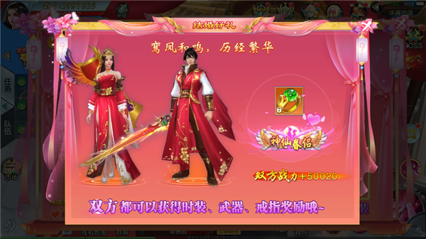 结婚系统是游戏内一个强社交性的系统玩法,满足了玩家与异性同伴一起闯荡仙侠大世界的需求。游戏内打造了丰富的结婚玩法,玩家可以通过求婚来寻找异性伴侣,通过参与【副本】、【圣地】等玩法获得夫妻装备,获得更高的战力加成和夫妻形象外观哦!