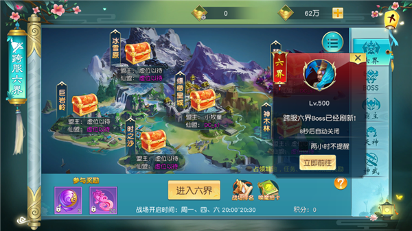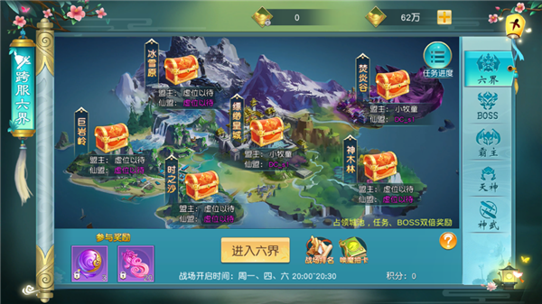 除了完成六界任务外,在每周一、四、六20:00~20:30开启的六界战场中,攻占旗帜可获得战场积分,在活动结束后各地图积分最高的仙盟会占领该地图,仙盟成员在该地图完成六界任务将会获得额外唤魔积分。