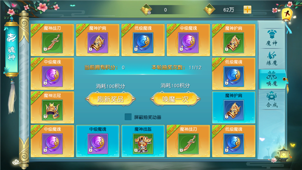 除了击杀六界boss外,魔神装备还可以通过【唤魔】抽奖获得。消耗100唤魔积分可刷新抽奖物品,再消耗100唤魔积分可以抽奖一个物品,当全部物品都抽完时需要再刷新一次。