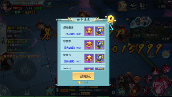 唤魔积分不够怎么办?别着急,通过【跨服六界】-【六界】进入每个地图完成任务后即可获得【唤魔积分】!如果没有时间完成全部任务,还可以消耗120绑定元宝选择快速完成哦!