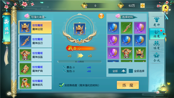 助战中的魔神装备可以在【炼魔】中进行强化。未强化的装备材料可使用元宝获得双倍熟练度,元宝数=双倍经验值/20,向下取整。已强化的装备材料将返还百分百的熟练度。